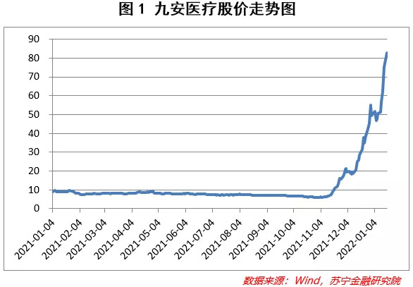 近几个月来,A股市场上最惹眼的股票莫过于九安医疗。从2021年11月起(见图1),其股价一骑绝尘,连翻14倍,市值由30亿飙升至380亿左右。更有投资人为了“感谢公司股票大涨”,想给公司捐款以奖励员工。
