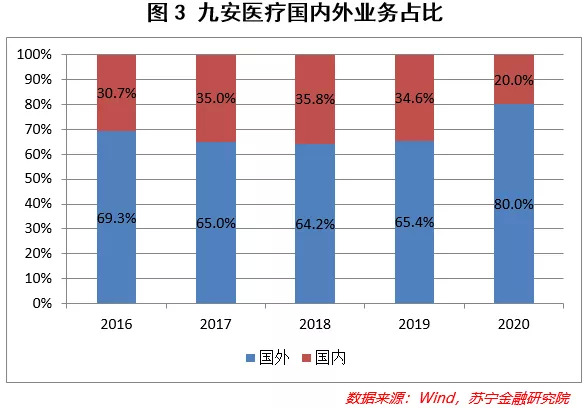 当然,机会总是留给有准备的人,九安在两方面的努力造就了这史诗级的荣耀。第一,九安医疗在过去十年中,努力经营美国市场,已经形成了完备的销售体系,拥有电商、药店、商超等广泛的铺货渠道,2020年,九安的海外业务收入占比超过八成(见图3)。第二,虽然新冠检测试剂的研发门槛较低,竞争激烈,但九安并没有放弃这一赛道,并且在FDA申请中充分发挥了积累的经验,获得了进入美国市场的王牌通行证;因此,研发、认证、铺货、销售一气呵成,也就成为了A股市场独一份的稀缺资源。