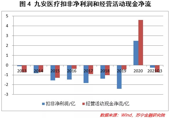 在疫情发生之前,九安医疗从传统的ODM/OEM生意转型为智能医疗硬件企业,深度绑定小米、苹果等。但从经营结果来看,九安在互联网医疗行业摸爬滚打多年,终是名不见经传,连续7年扣非净利润和经营活动现金净流均为负值(见图4),曾有一段时间更是在被ST的边缘苦苦挣扎,此前的江河日下与当前的波涛汹涌简直是天壤之别。