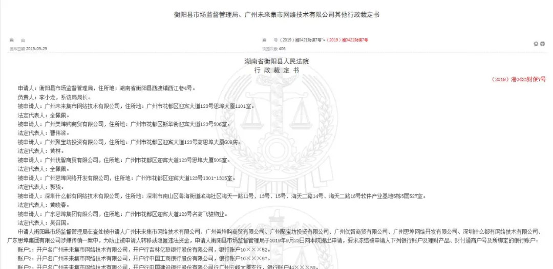 根据中国裁判文书网显示,2019年9月,湖南衡阳县人民法院按照国务院《禁止传销条例》的规定,裁定冻结了广州未来集市网络科技有限公司、思埠集团及其关联公司等多家企业的十三个银行账户及理财产品、财付通商户号及所绑定的银行账号(详见《因涉嫌传销被冻结账户,未来集市还有未来吗?》)。