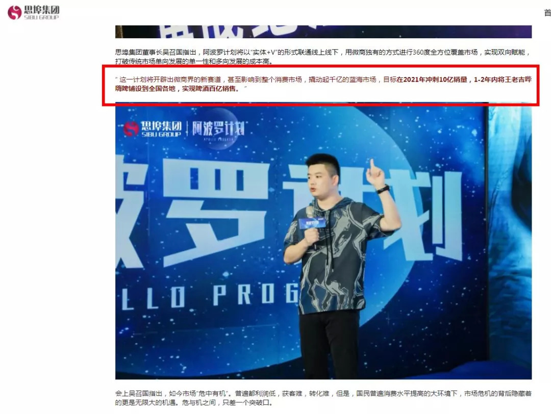 据悉,上述企业被冻结资金,或与吴召国正在火热推广的“王老吉哔嗨啤”有紧密联系。根据思埠官网信息显示,“去年6月27日,思埠集团启动‘阿波罗计划’,宣布联合广药创赢,达成王老吉啤酒战略合作,打造联名款‘王老吉哔嗨啤’,计划在未来1~2年内做到100亿,2021年预计目标做到10亿销售额”。