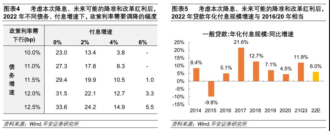 考虑到目前稳中趋松的货币政策基调与加强支持实体经济的诉求,假设2022年我国信贷规模以11%~12%的速度增长,将本次MLF降息10bp纳入考虑、并结合以上工具的使用,我们预计2022年实体经济的付息增速有望降至6%左右,货币政策支持力度略强于2019年,但仍低于2015年、2016年和2020年的水平。我们认为,今年一季度的经济金融数据将成为重要的观测窗口,若本次降息后“宽信用”仍不及预期,且房地产投资拖累下经济减速风险加大,政策利率不排除再次调低的可能性。