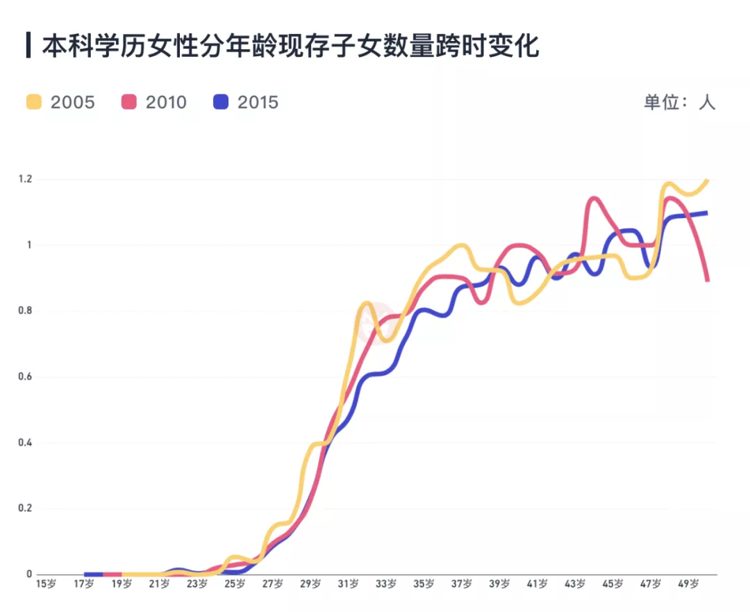 根据2015年小普查,小学学历女性从16岁便开始生育子女,直到35岁达到顶峰,平均在35岁时有1.6个孩子。而本科学历女性从26岁才开始生育,上升得也比较缓慢,到30岁时,平均要比小学学历女性少一个孩子。