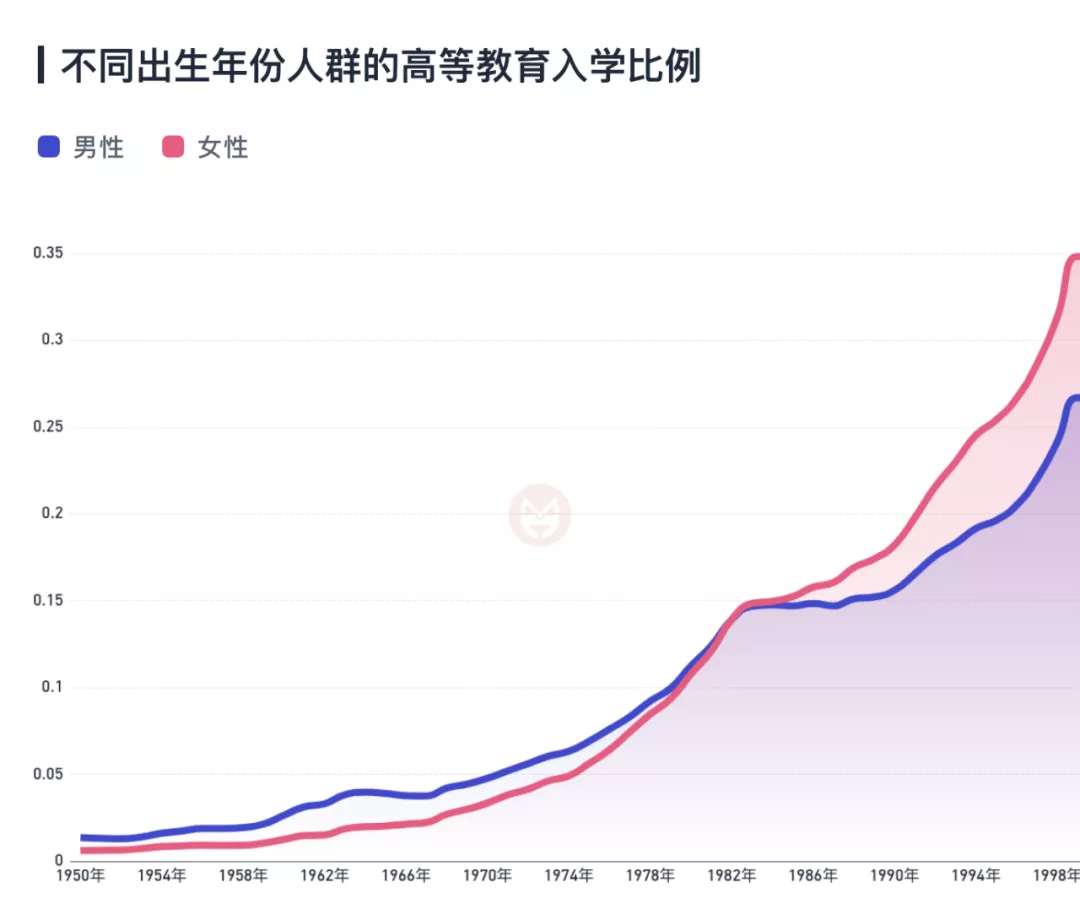 坐近了一瞅,你就能发现,这台又小又暗的电视机,和之前那台又大又亮的电视,其实拥有相同的像素点。只不过组合比例有所不同——那部大电视上,发出暗淡红光的像素点占比只有百分之十(70、80后的本科及以上概率是10%),而在小电视上,这些像素点占比超过了三分之一(99年开始女性上大学比例超过了34%)。加上屏幕很小(出生人口少了一半),看起来的效果当然不好。