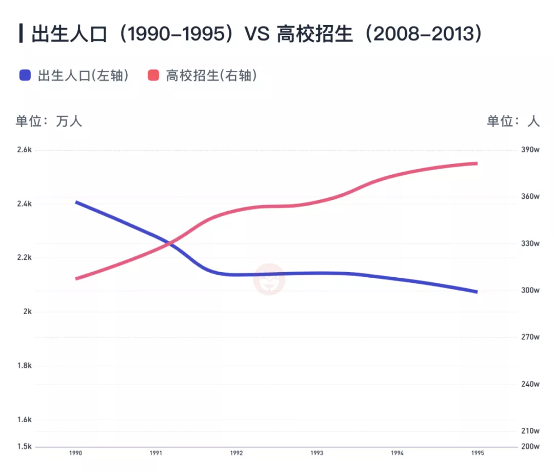 而为何本科和研究生女性占比大幅提高呢?还是得要回到30年前找原因。90年代初,出生人口快速下降,从1990年到1995年5年内就下降了14%,而20年后为这批人口提供的高等教育招生数却在不断上升,5年提高了24%,此消彼长,本科生占比自然就快速提升了。