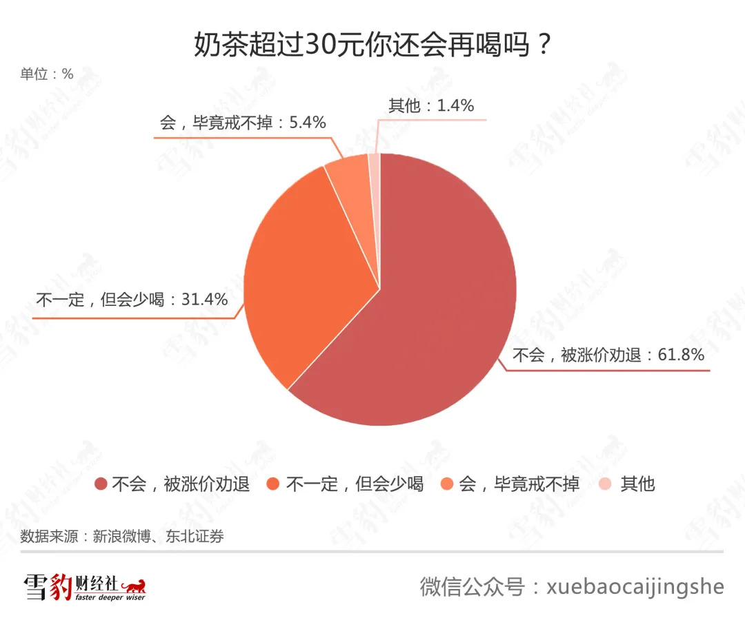 愿意为高价饮品买单的消费者是少数。2020年,新浪新闻曾发起“奶茶超过30元你还会再喝吗?”投票,187.8万人参与的投票结果显示:61.8%的人直接表示会被30元的价格“劝退”,31.4%的人则表示“会少喝”。