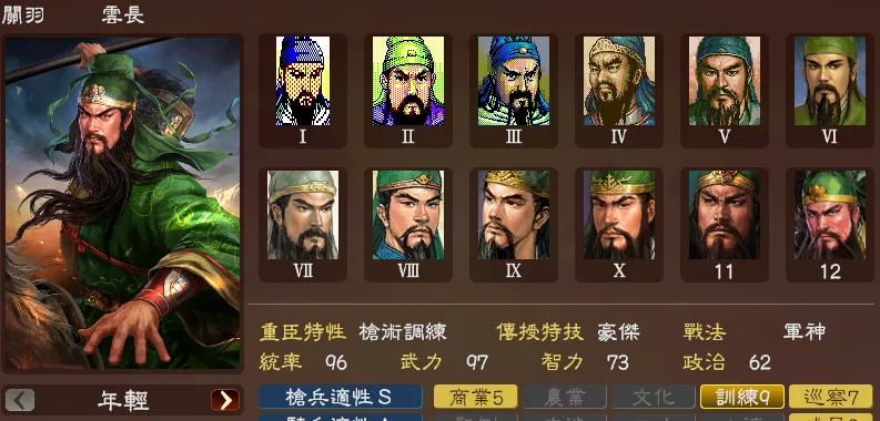 不管别人的颜色怎么变,当时日本的关羽倒是统一身着青衣,“绿帽”果然还是从94版《三国演义》开始才流行起来的。在光荣历代《三国志》头像中也可以明显观察到关羽“绿化”的过程。