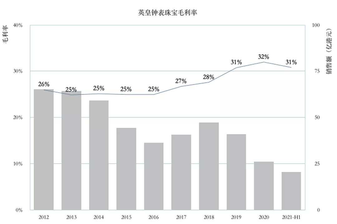 英皇钟表与珠宝,其毛利率变化趋势与东方表行基本一致,从2017年之前的25%左右一路提升,最近三年维持在31%上下。