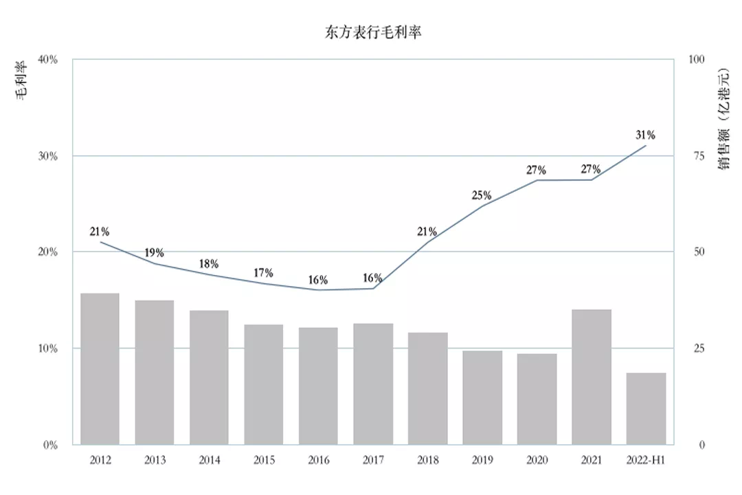东方表行,销售额过去五个财年间各有涨跌,但毛利率一直上升。2018财年之前,毛利率在20%以下,之后一路攀升,即使是收入最不好的2020财年,毛利率仍达27%,而2021年4月到9月这半个财年,毛利率更是增至31%。