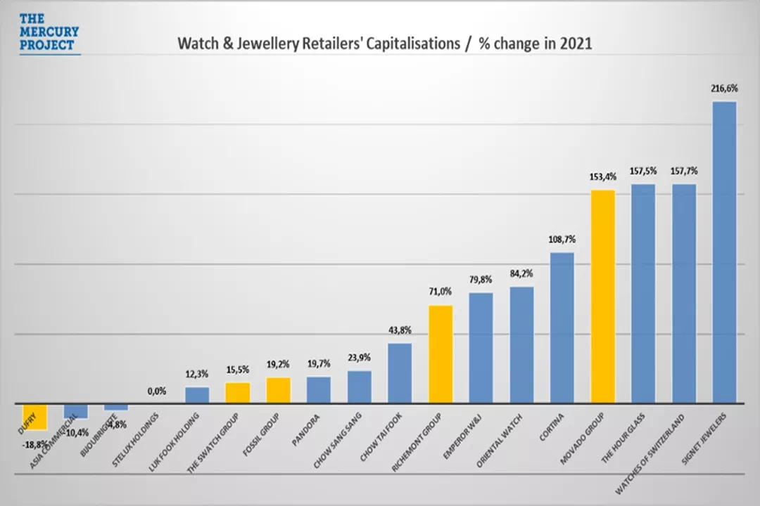 据瑞士网站The Mercury Project统计,一些重要的上市钟表经销商,在2021年间股价大幅上涨,甚至超过了钟表制造商们。