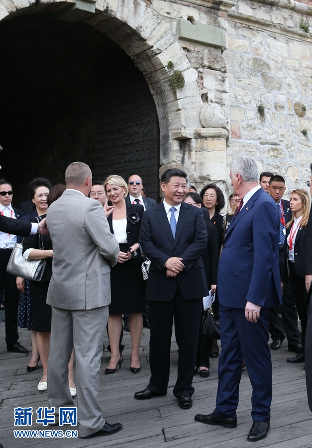 奠基仪式后,习近平和彭丽媛在尼科利奇夫妇陪同下参观具有悠久历史的卡莱梅格丹公园。