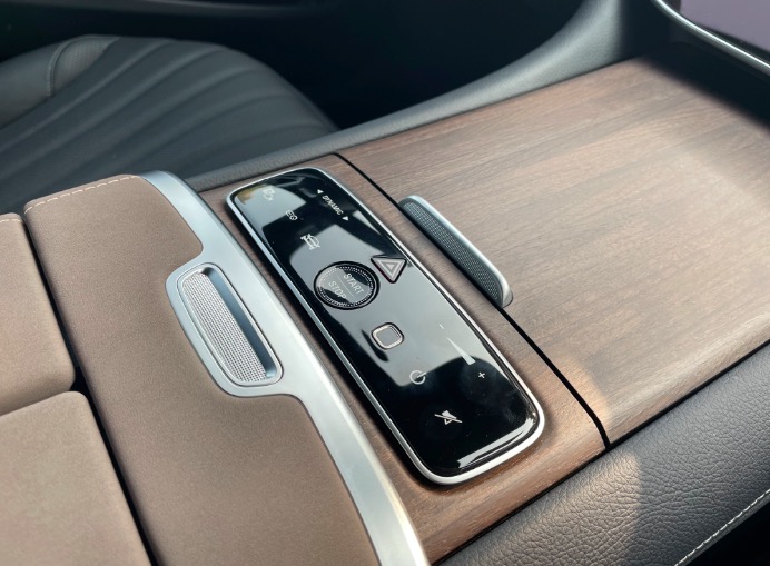 后排中间可翻折的扶手中拥有多重巧思。它可以通过一块小pad控制车内娱乐系统,后方还拥有隐藏式的手机无线充电面板。扶手顶端则拥有两级回馈功能,按一下弹出一小部分用于摆放手机;再按一下,则可弹出后排杯托。