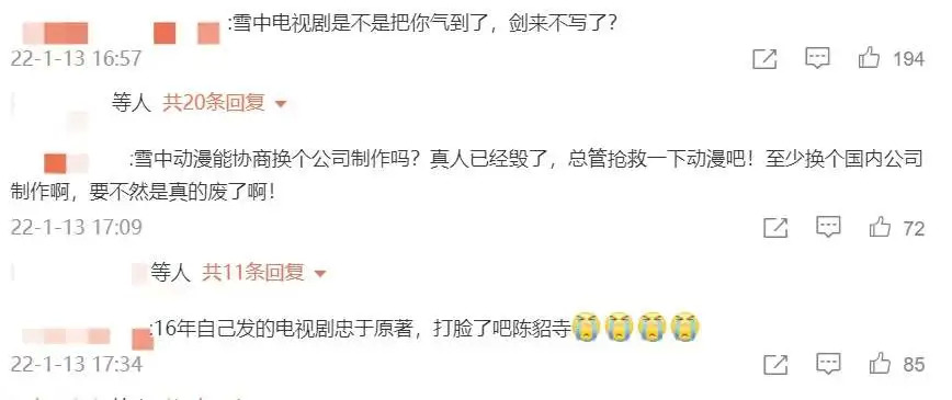 QQ阅读上原著的评论页里,常见“被电视剧恶心到了,回来复习一遍”之类的抱怨,原作者烽火戏诸侯的微博也是不满改编的读者们聚集的地方,早在播出不久,就有粉丝斥责作者:“你知道这一夜有多少江湖儿女被气得失眠吗!对得起我们这些真心喜欢雪中的书迷吗?”