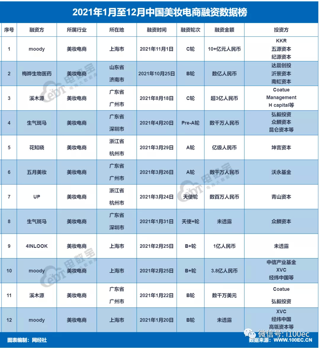以下国内专业电商投融资服务平台网经社“电融宝”(FA.100EC.CN)为您带来的2021年美妆电商详细融资事件: