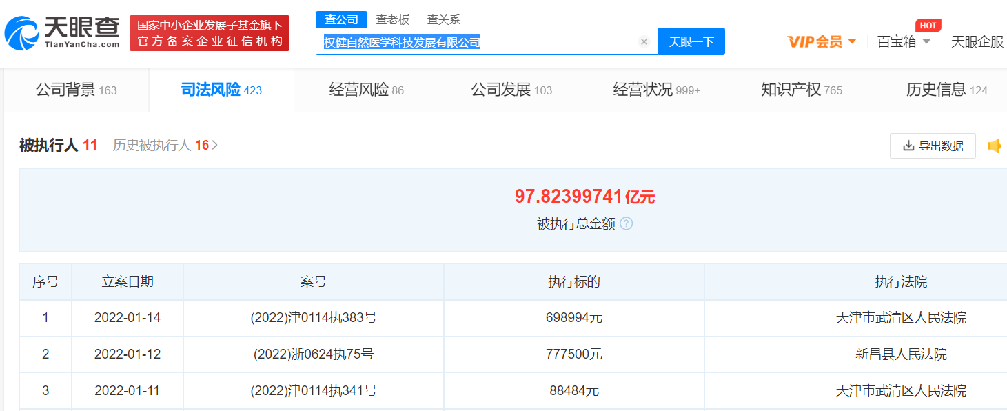天眼查APP显示,近日,权健自然医学科技发展有限公司再新增3条被执行人信息,执行标的共计156.5万元,执行法院为天津市武清区人民法院、新昌县人民法院。目前,该公司累计被执行金额达97.82亿元。