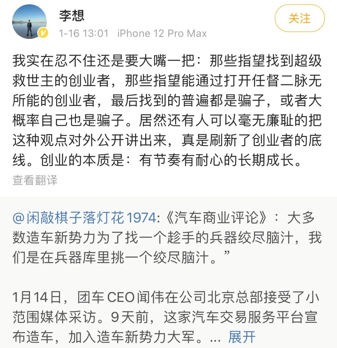前两天,李想在转发评论了团车CEO闻伟的一篇采访,表示“实在忍不住要嘴一把”,称后者“毫无廉耻、大概率是骗子、刷新了创业者的底线”!