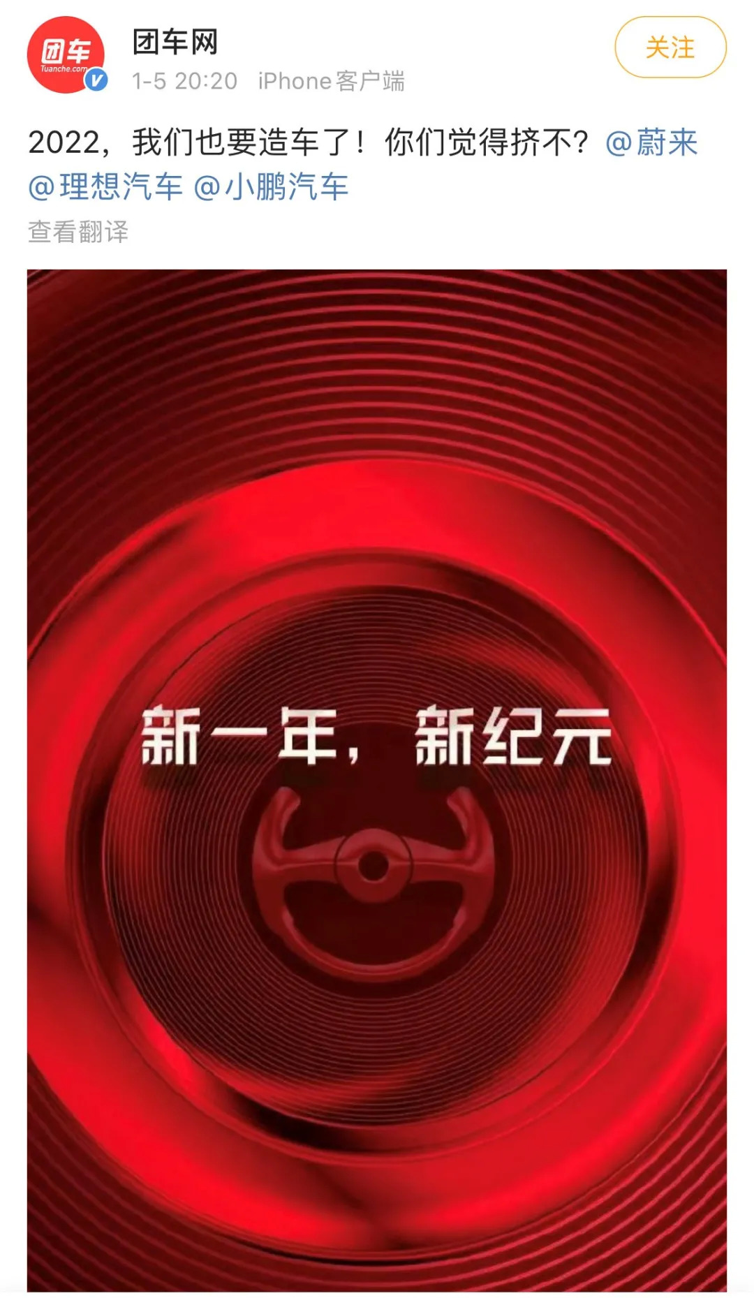 1月5日,它高调发布了一条微博:“2022,我们也要造车了!你们觉得挤不?”并@了蔚来、理想和小鹏。