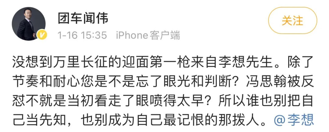 “没想到万里长征的迎面第一枪来自李想先生。除了节奏和耐心您是不是忘了眼光和判断?冯思翰被反怼不就是当初看走了眼喷得太早?所以谁也别把自己当先知,也别成为自己最记恨的那拨人。”