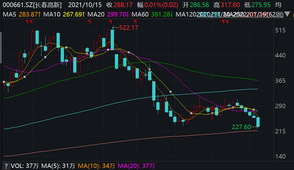 对于持有医药主题基金的基民来说,更担心的则是长春高新是否会拖累基金净值。自去年2月份,随着“喝酒吃药”抱团股行情的结束,长春高新的股价也从最高价522.2元跌到了今日的227.6元,创出近2年来的新低。