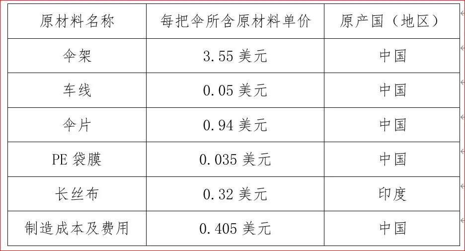 某中国制造商生产庭院用伞(HS 6601.10)出口至新加坡,FOB价为每把5.3美元,生产工序均在中国完成。庭院用伞原材料情况如下: