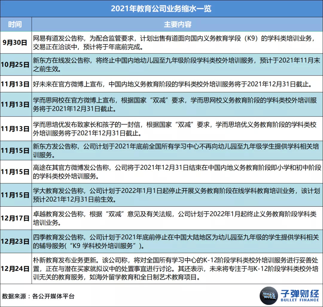 首先是业务缩水。「子弹财经」注意到,好未来、高途等头部教培机构纷纷官宣于2021年底之前终止或出售义务教育阶段的学科类培训业务。
