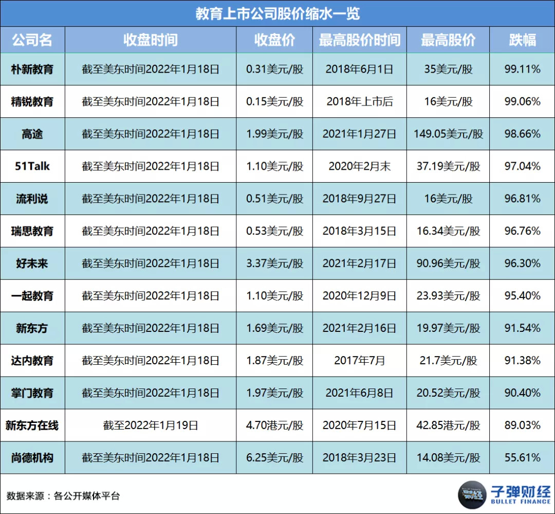 据「子弹财经」统计,截至美东时间2022年1月18日收盘,朴新教育、精锐教育、高途、51Talk、流利说、瑞思教育、好未来、一起教育、达内教育和掌门教育等上市公司的股价分别较其历史最高点出现大跌。