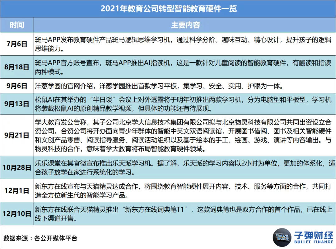 在上述热门赛道外,还有企业转型智能教育硬件。2021年7月6日,斑马APP发布教育硬件产品斑马逻辑思维学习机;10月28日,乐乐课堂在其官微宣布推出乐天派学习机;12月10日,新东方在线联合天猫精灵推出“新东方在线词典笔T1”。