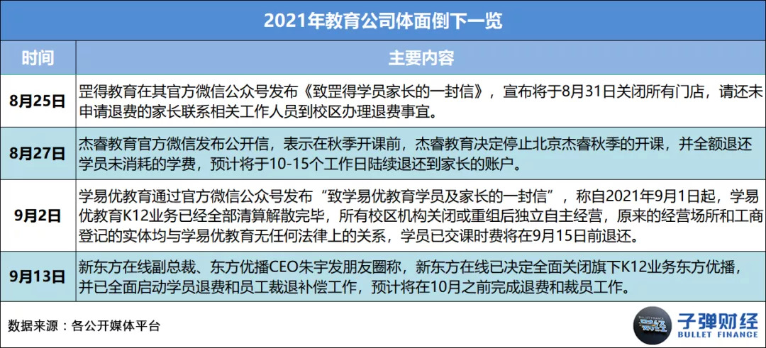 K12赛道的一些机构也陆续跟用户们道别。2021年8月25日,罡得教育宣布将于8月31日关闭所有门店,请还未申请退费的家长联系相关工作人员到校区办理退费事宜;8月27日,杰睿教育表示在秋季开课前,将停止北京杰睿秋季的开课,并全额退还学员未消耗的学费,预计将于10-15个工作日陆续退还到家长的账户。