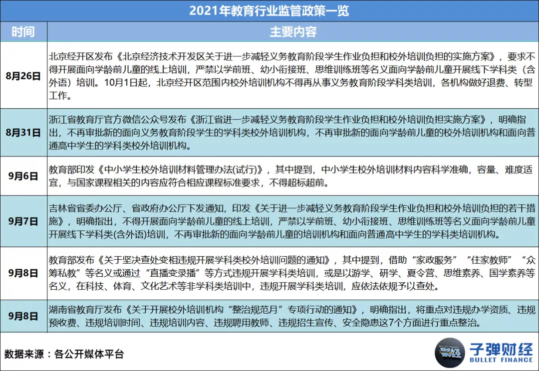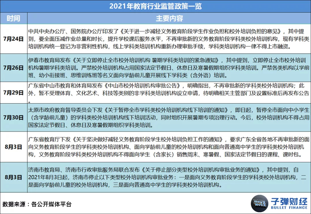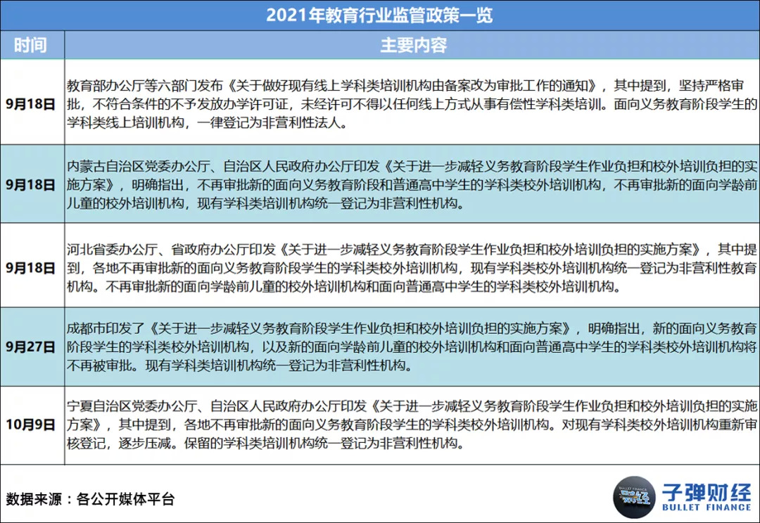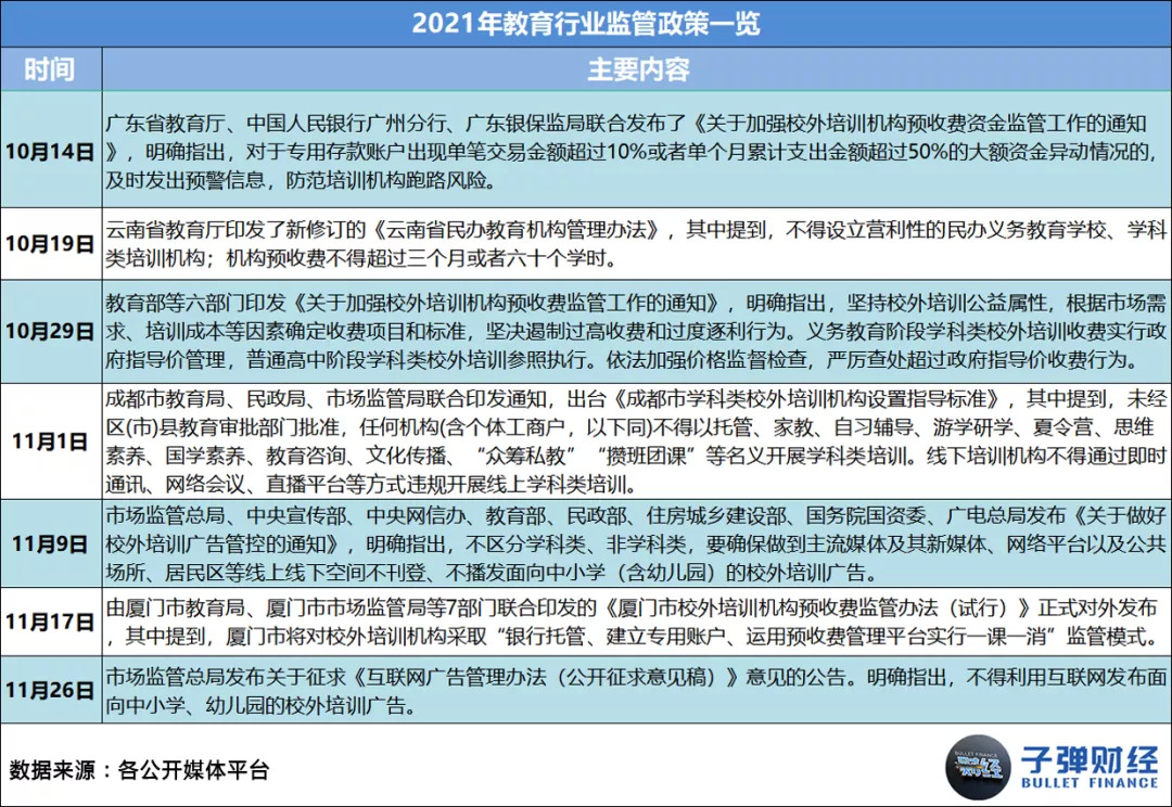 其一,国家层面的监管政策频繁出台,直接让各机构在业务、财务和运营层面都遭遇了史无前例的严厉管控。据「子弹财经」统计,2021年1-11月,教育行业相关监管政策共出台56条,平均每月至少有5条。