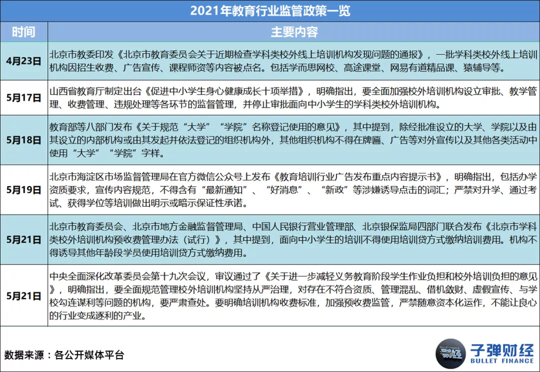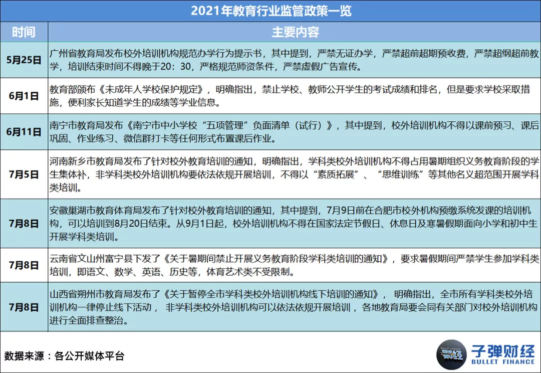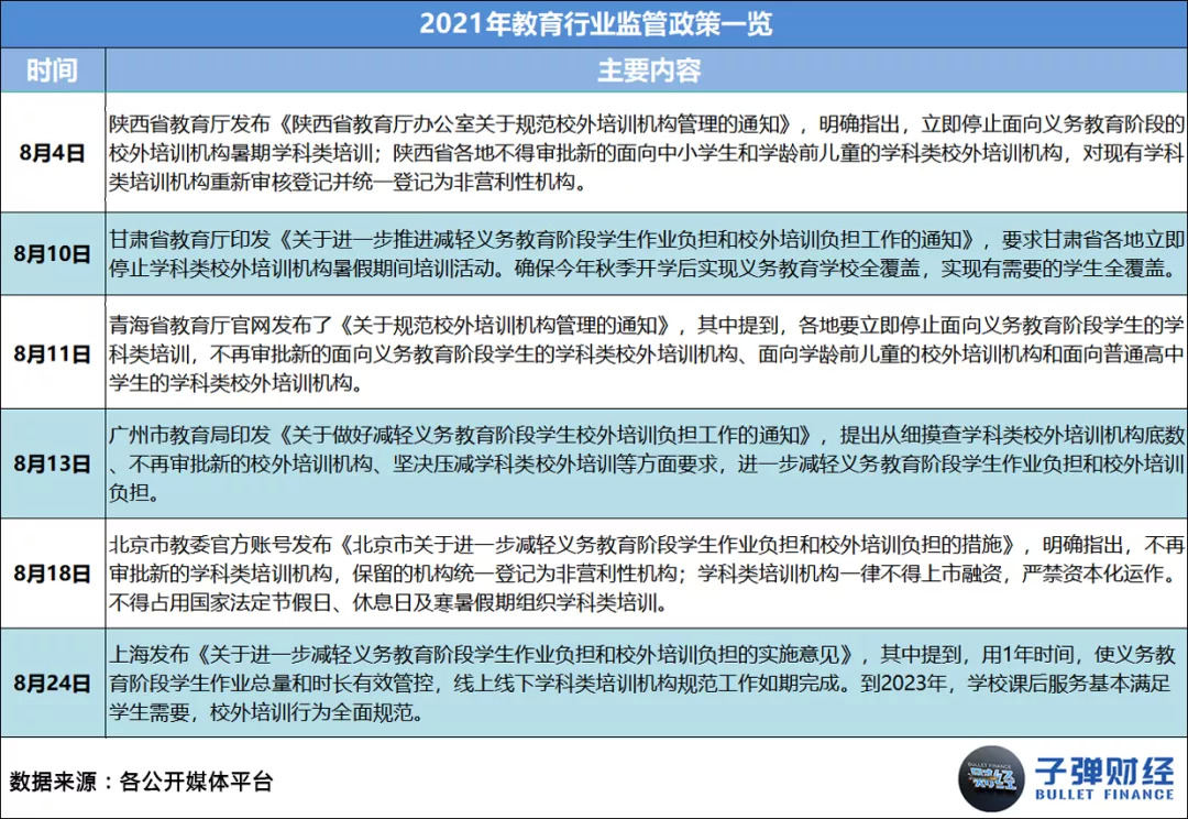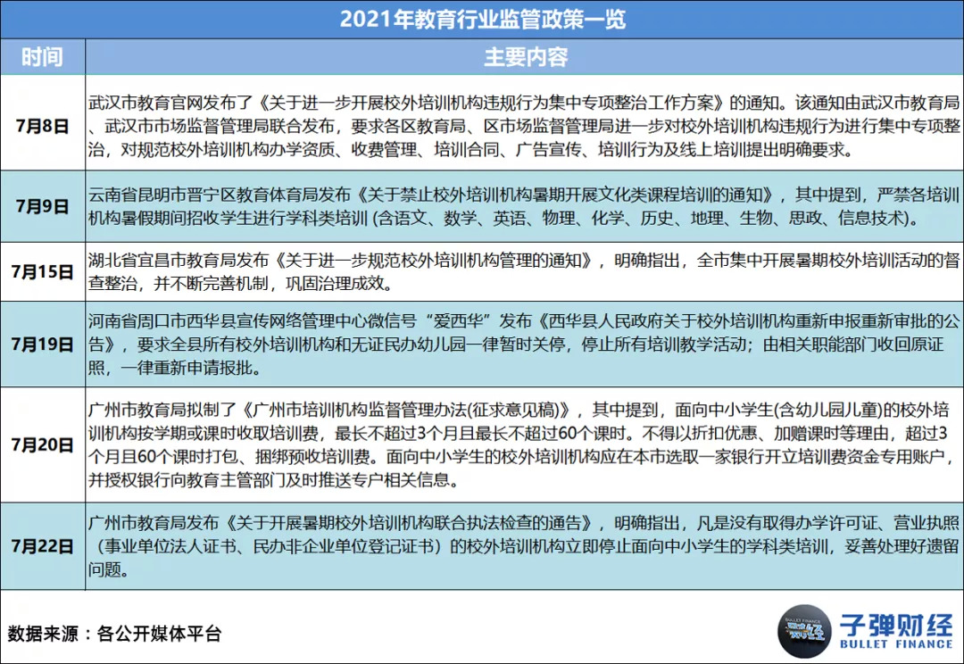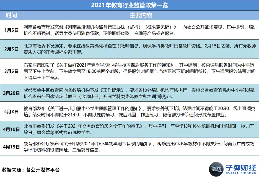 其一,国家层面的监管政策频繁出台,直接让各机构在业务、财务和运营层面都遭遇了史无前例的严厉管控。据「子弹财经」统计,2021年1-11月,教育行业相关监管政策共出台56条,平均每月至少有5条。
