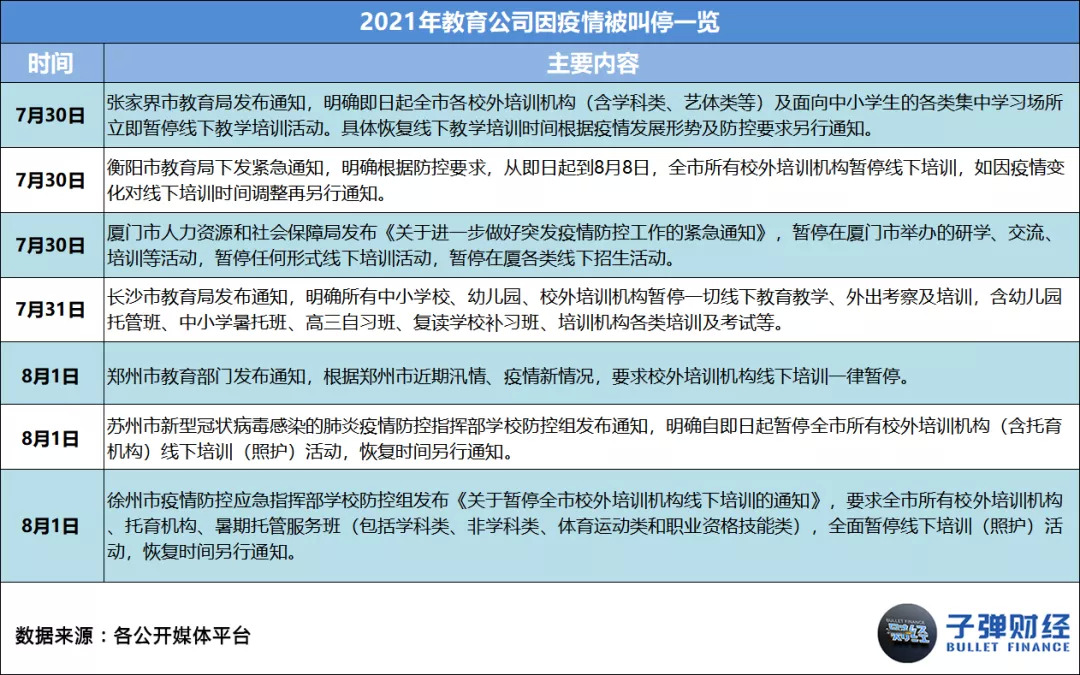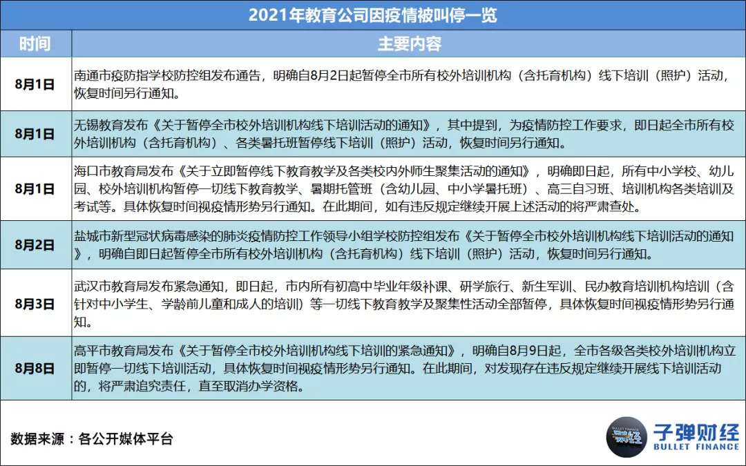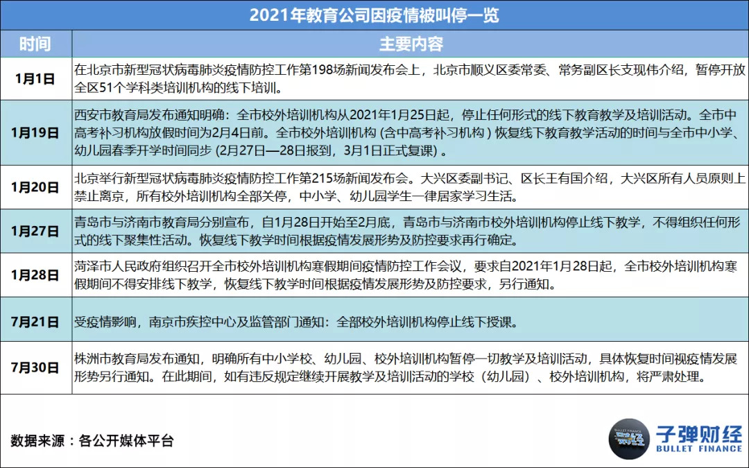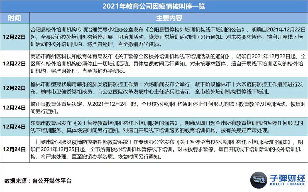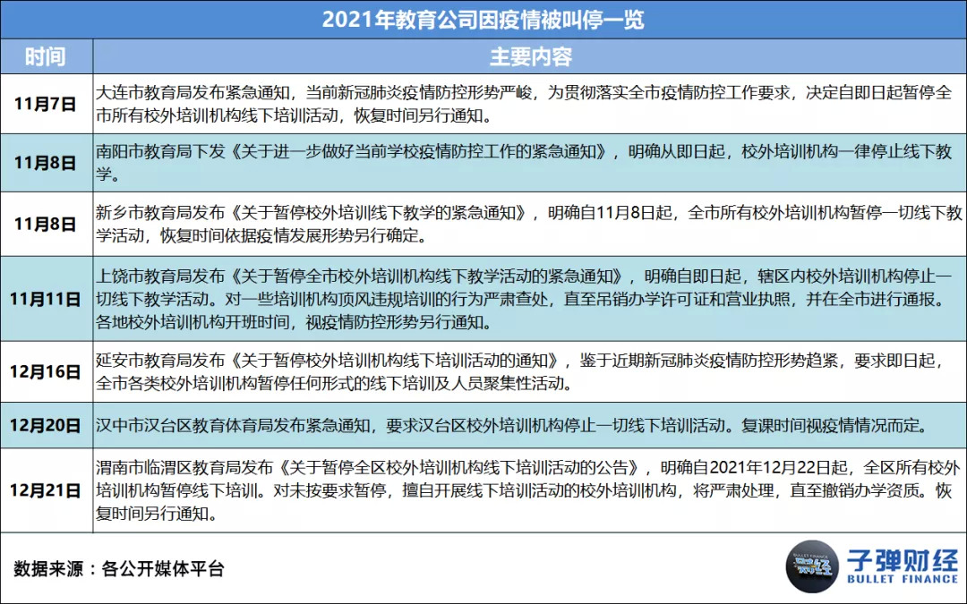 据「子弹财经」统计,2021年,教育公司因疫情被相关主管部门叫停事件数共33起,平均每月约有3起。