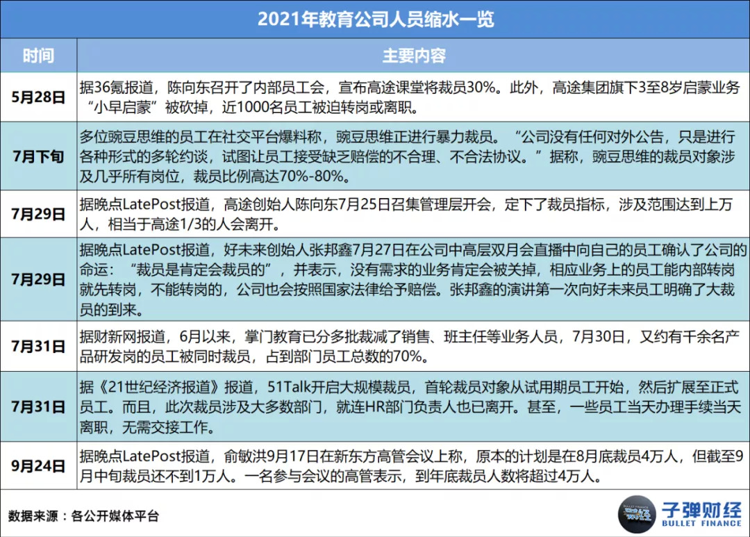 其次是人员规模缩水。据「子弹财经」了解,高途、豌豆思维、好未来、掌门教育、51Talk等公司曾相继被曝出大裁员的消息。