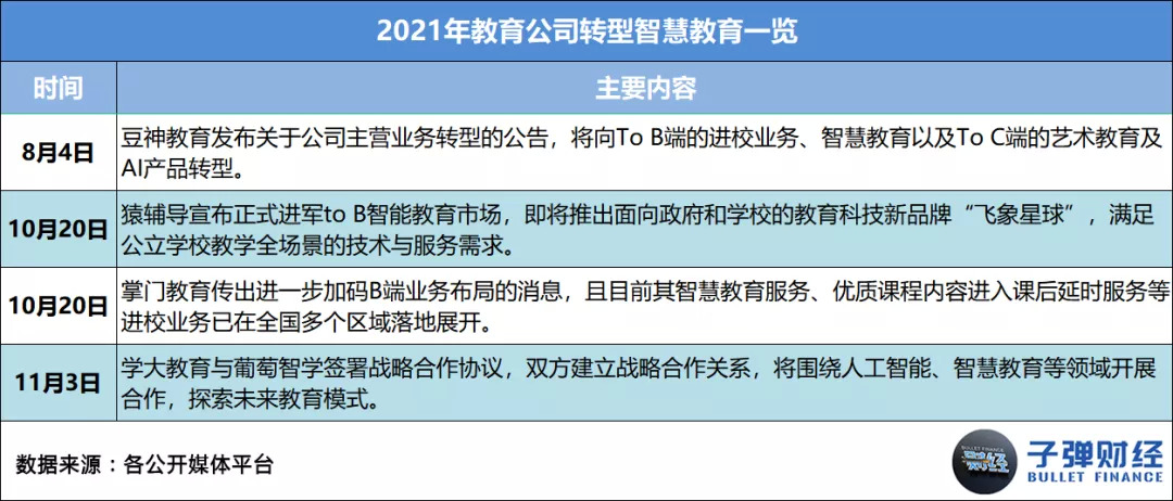 更有甚者,直接转型智慧教育。2021年10月20日,猿辅导宣布进军to B智能教育市场,即将推出面向政府和学校的教育科技新品牌“飞象星球”;10月20日,掌门教育传出进一步加码B端业务布局的消息,且目前其智慧教育服务已在全国多个区域落地展开;11月3日,学大教育与葡萄智学达成战略合作,将围绕智慧教育等领域开展合作,探索未来教育模式。