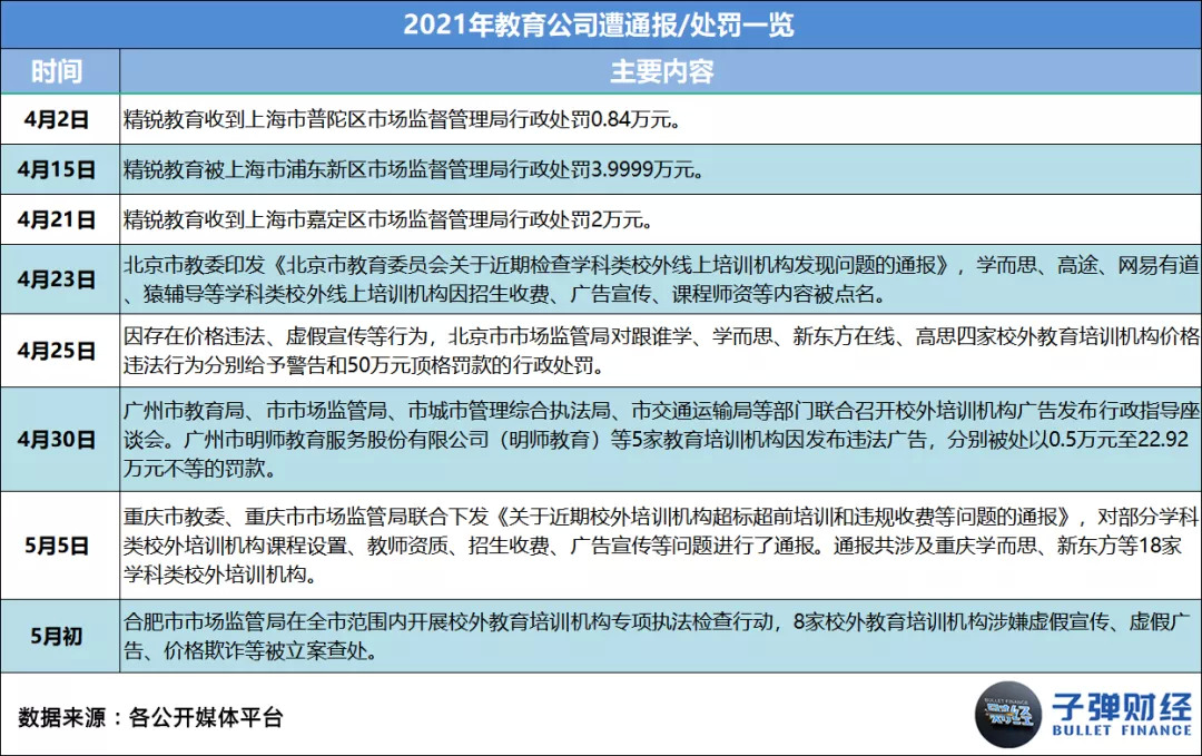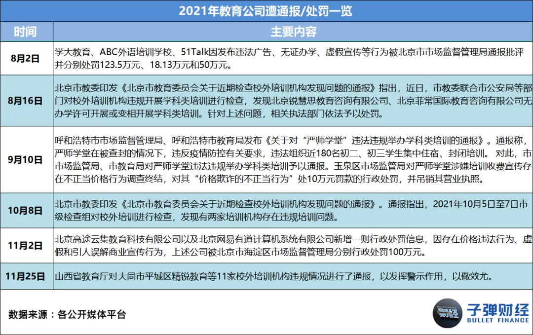 据「子弹财经」统计,2021年4-11月,教育公司遭相关监管部门通报或处罚事件数共22起,平均每月约有3起。