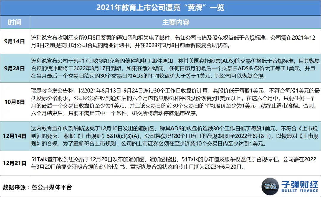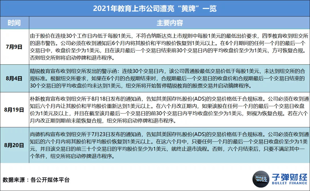 因为股价持续走低的原因,一些教育中概股遭纽交所或纳斯达克亮“黄牌”。