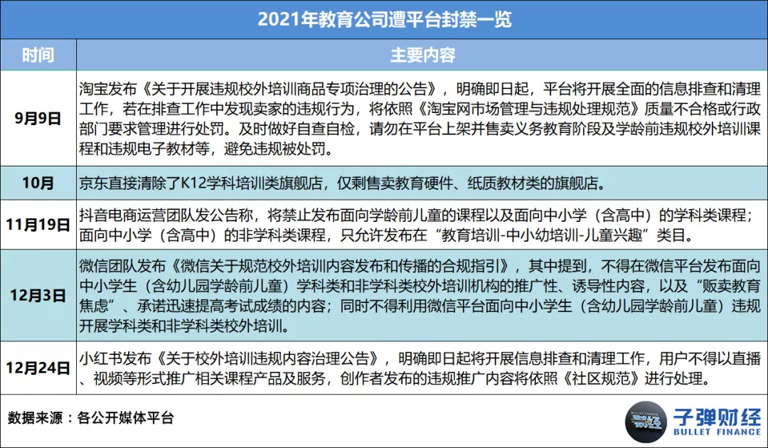 自2021年9月以来,淘宝、京东、抖音、微信、小红书等平台纷纷对校外培训机构实施严格封禁。
