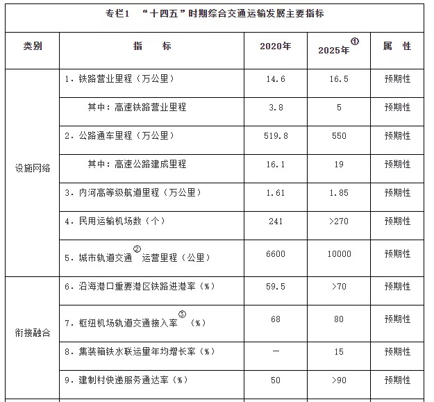 其中对建设目标进行了明确。比如,250公里及以上时速标准的高速铁路网对50万人口以上城市覆盖率达到95%以上;重点城市群一体化交通网络、都市圈1小时通勤网加快形成,沿边国道基本贯通。