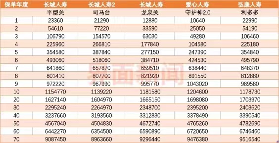 根据保险销售提供的演示数据,长城人寿新出的三款增额终身寿险的回本时间都为8年,与之前的网红产品弘康人寿“利多多”和爱心人寿“守护神2.0”相同。在回本之后的增长期,”龙泉关”的收益水平与“利多多”及“守护神2.0”持平,但随着时间的推移,收益的差异被拉开至数十万元。