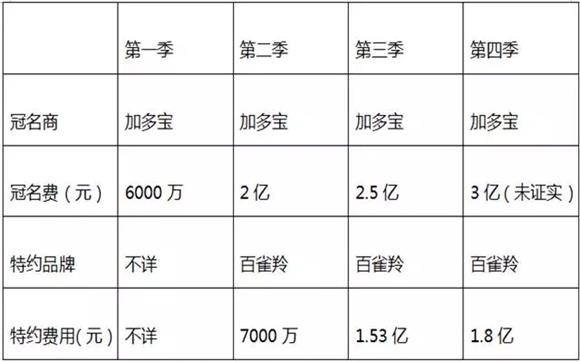 而另一方面,冠名费也实现从6000万元、2亿元到2.5亿元的三连跳,至第四季据称冠名费已高达3亿元。