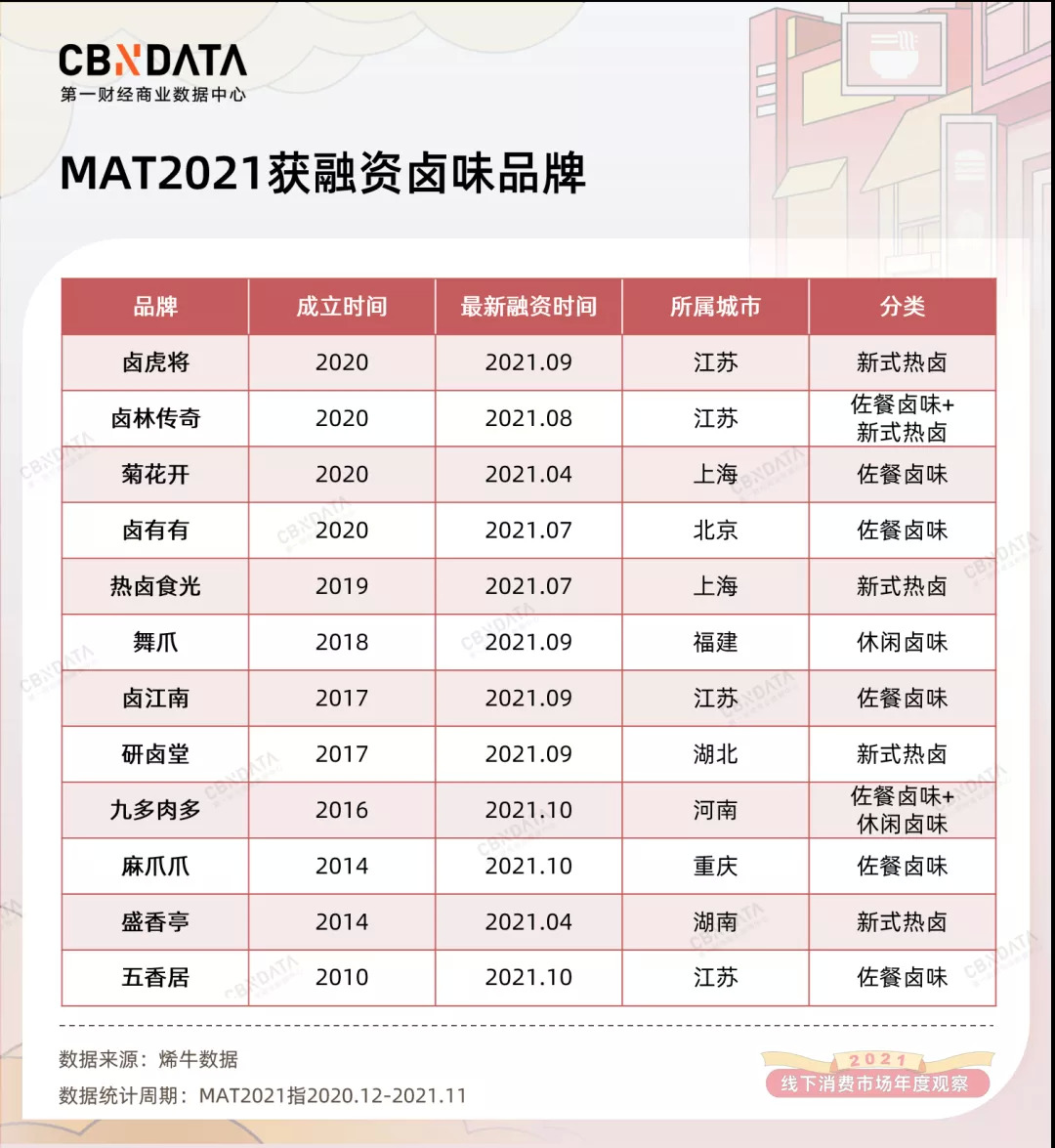 纵观2021年,佐餐卤味品牌紫燕百味鸡冲刺上市;年内获得融资的卤味品牌中,佐餐卤味和新式热卤是最受资本青睐的类型,也有部分品牌走“复合”路线。过去主要由“三巨头”打下的由休闲卤味占据行业头部的局面或将被打破。卤味赛道的竞争重点,或已从消闲零食,向家庭佐餐甚至热卤快餐转移。