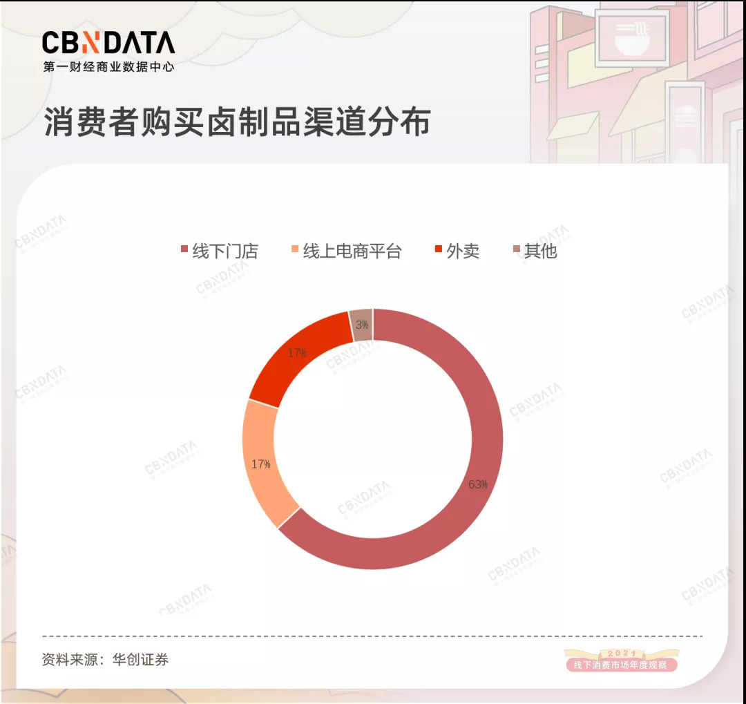 随着锁鲜装、冷链技术的普及,以及越来越多互联网卤味零食品牌的出现,线上卤味消费规模近年来不断增加。但线下依旧是卤味消费的最主要渠道,占据超6成的市场份额。