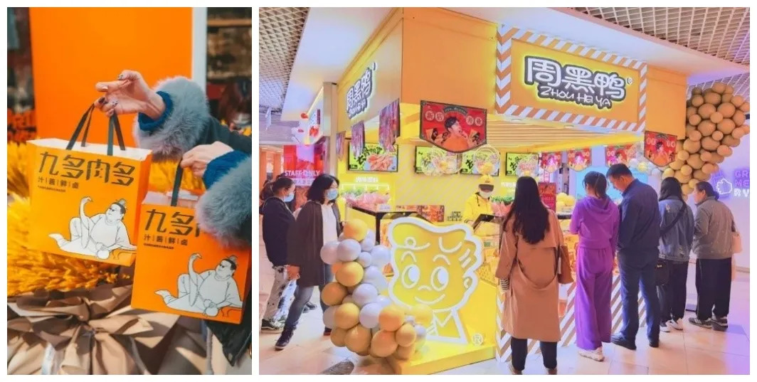 左:九多肉多升级后的产品包装及IP形象|图片来源:郑州电视台天天美食栏目,右:周黑鸭“小黄店”首店|图片来源:旅游与美食