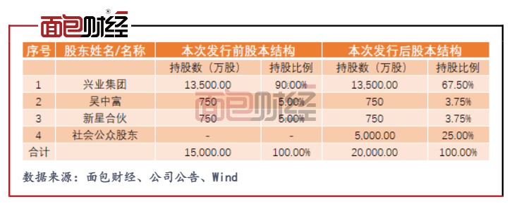 2017年兴业有限最后一次股权转让,兴业集团将10%股份以6.50元/注册资本的价格分别转让给总经理吴中富、新星合伙(持股平台),双方各5%。2018年8月,兴业有限整体变更设立为股份公司。