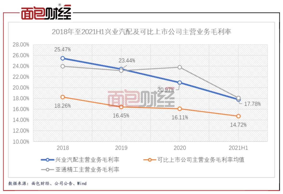 在5家可比公司中,亚通精工的主要产品为商用车车身类产品,与公司主营业务的可比性较强。2020年和2021年上半年,亚通精工主营业务毛利率分别为23.79%和18.07%,略高于兴业汽配。