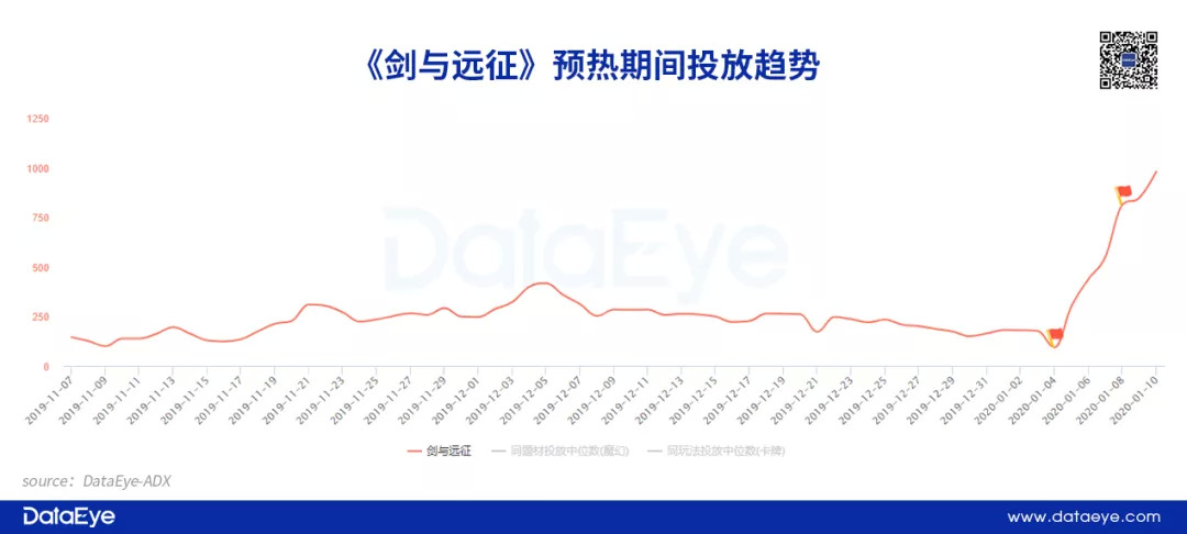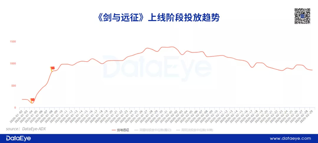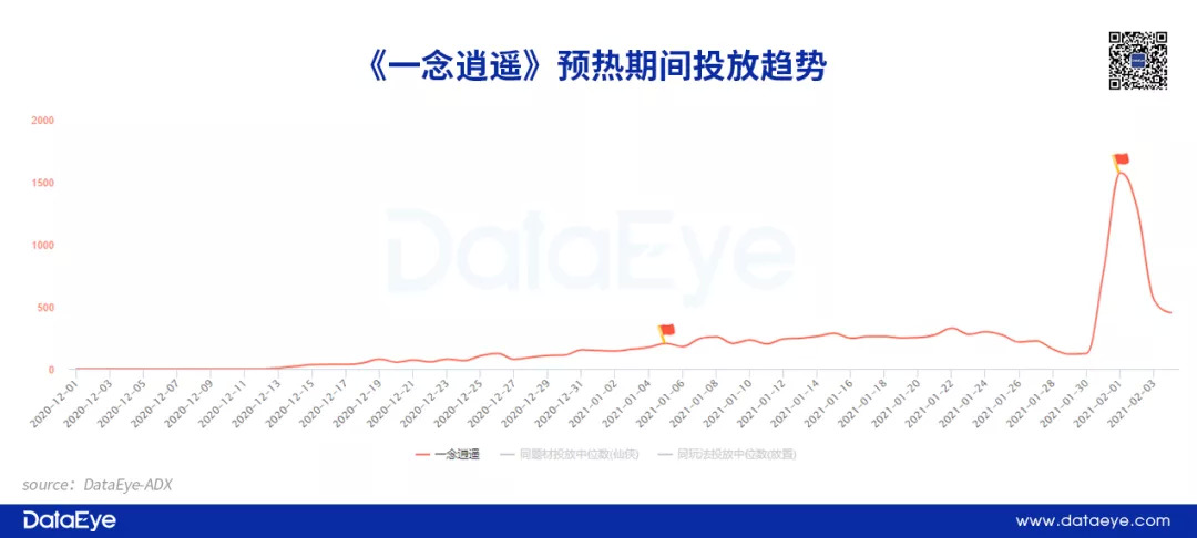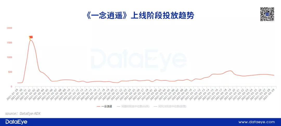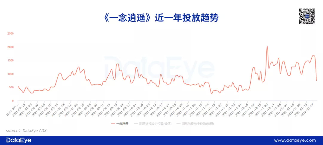 从数据上看,两款放置品类游戏在上线初期投放更显“踏实”,一方面通过小规模投放“混脸熟”,另一方面是测试素材整体流量情况。事实上,已经在海外取得一定成绩的《剑与远征》同样以相对谨慎的投放策略来测试国内的“吸量情况”,而无IP的《一念逍遥》更是如此。
