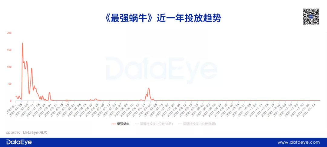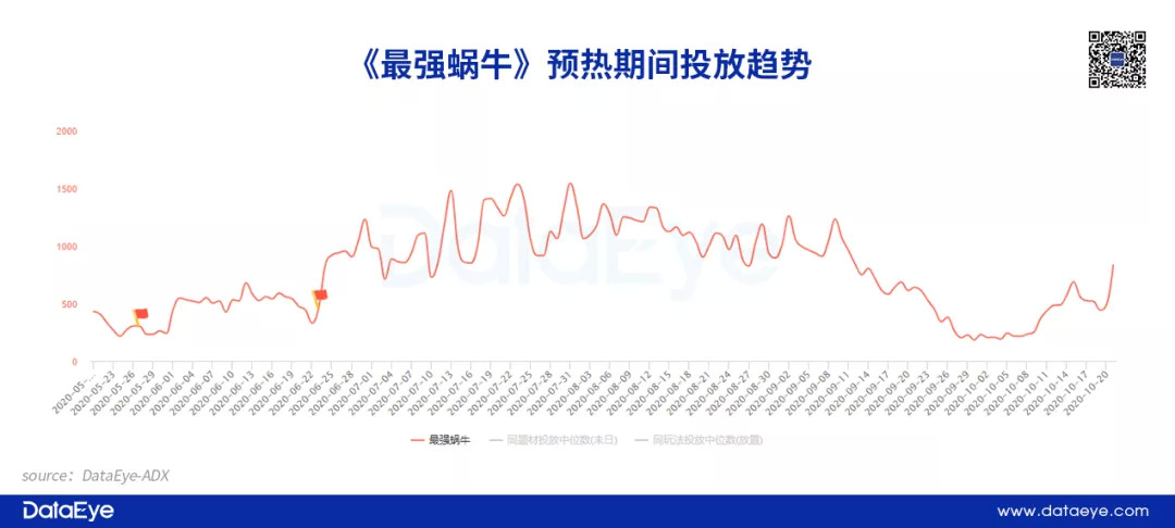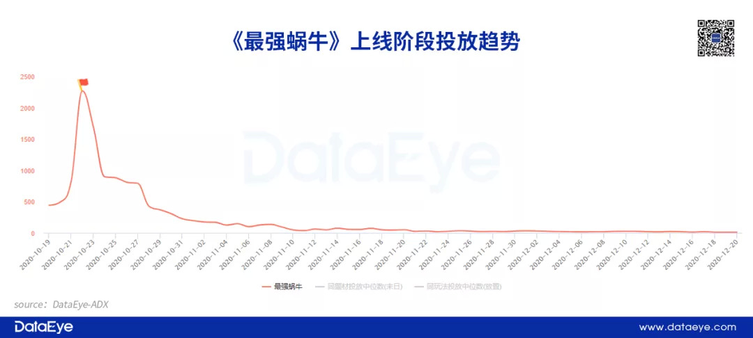 关键词3:达人营销。达人营销已经成为不少产品长线运营阶段的首选,其中《最强蜗牛》在营销思路的转变上显得非常“彻底”。《最强蜗牛》在上线爆发阶段后整体投放力度出现明显的下降近一年日均投放量不超过5组,仅仅春节假期联动电影《唐人街探案》以及一周年庆典时稍微提高投放,其余时间均不作任何投放。