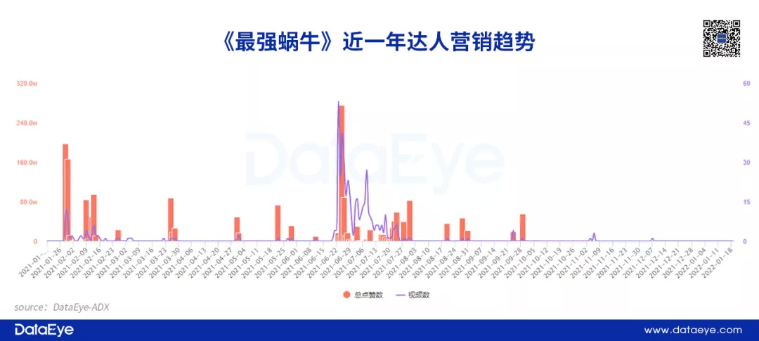 通过DataEye-ADX达人营销分析数据显示,近一年时间内《最强蜗牛》多次进行达人视频营销,达人视频总数约为1530条,达人视频总点赞量高达3796W次。特别在一周年庆典期间,项目组更注重达人视频营销,单日产出超过50条达人视频,同时获得270W点赞数。观察数据发现,《最强蜗牛》并没有以大规模数量取胜,而是精耕细作地制作视频内容,注重内容创意和品质。