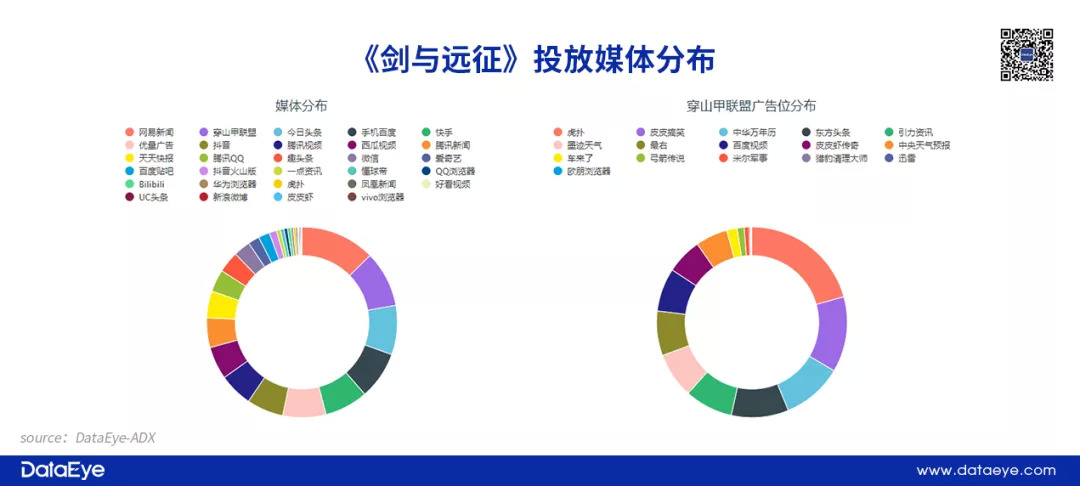 通过观察,《最强蜗牛》在产品上线阶段投放渠道约为20个,《一念逍遥》投放渠道约为21个。而《剑与远征》在产品上线爆发阶段展开了覆盖面更广的投放策略,投放渠道多达31个,投放广告位超过80个。