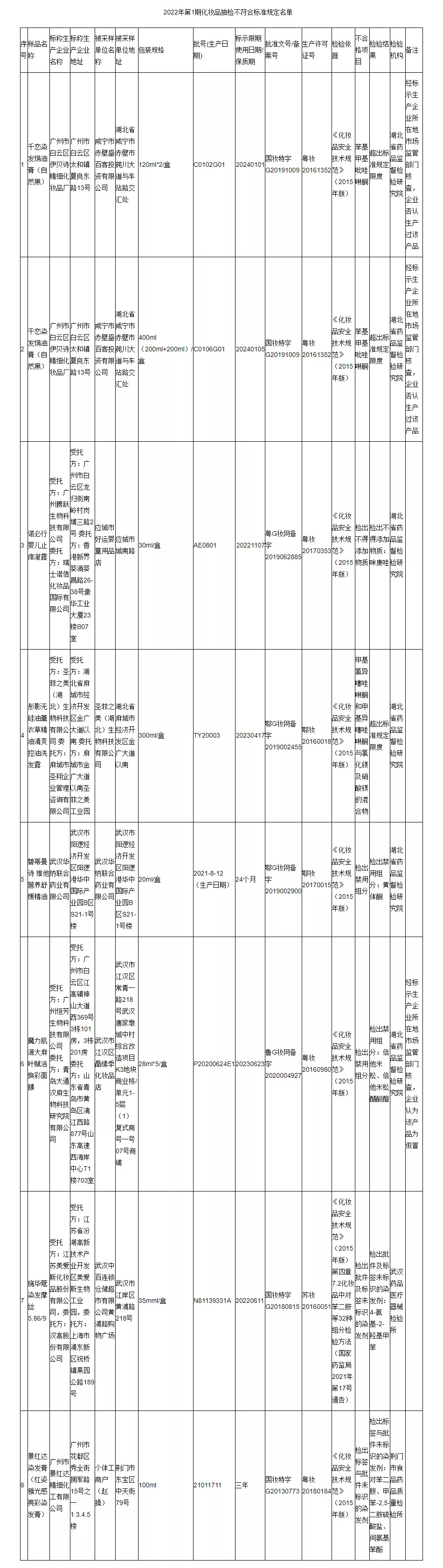(注:①由广州市白云区莱丹精细化工厂生产的索菲雅染发膏(自然黑)因标签标识和苯基甲基吡唑啉酮(0.34%)为不合格项目;②由广州市绮妆化妆品有限公司生产的绮妆染发膏(黑色)因标签标识和苯基甲基吡唑啉酮(0.60%)为不合格项目项目;③由广州市新霸化妆品有限公司生产的绮妆染发膏(黑色)因标签标识和苯基甲基吡唑啉酮(0.38%)为不合格项目项目;新派染发膏(自然黑色)因标签标识和苯基甲基吡唑啉酮(0.31%)为不合格项目项目;④由广州市佳桐化妆品有限公司生产的艾贝尔染发膏(自然黑)因标签标识和苯基甲基吡唑啉酮(0.52%)为不合格项目。)
