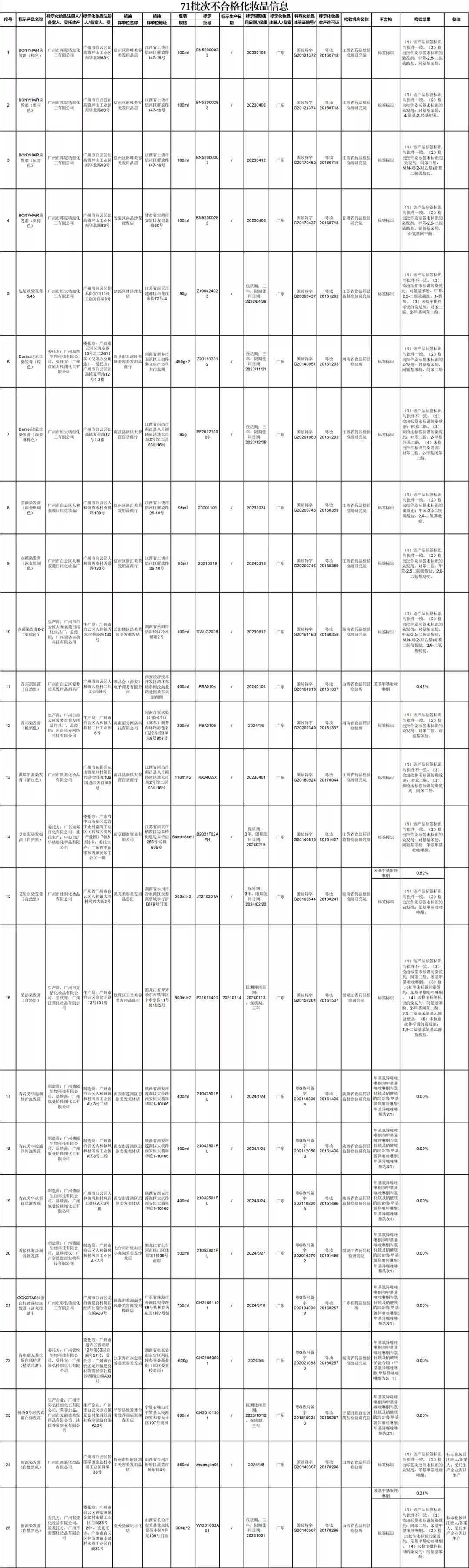 根据国家药监局发布的通告,在2021年国家化妆品监督抽检工作中,经江西省药品检验检测研究院等单位检验,标示为广州市邦妮精细化工有限公司生产的BONYHAiR染发霜(棕色)等71批次化妆品不合格。